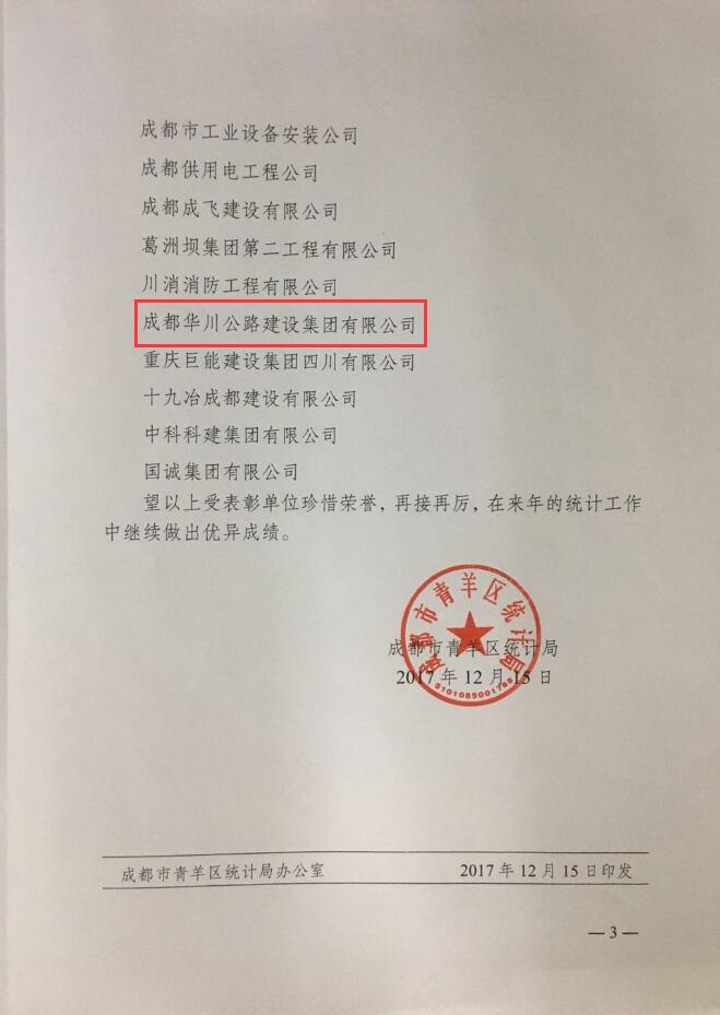 1月24日上午,青羊區(qū)統(tǒng)計(jì)局組織召開2017年建設(shè)領(lǐng)域統(tǒng)計(jì)工作年報(bào)會,對全區(qū)36家2017年度統(tǒng)計(jì)工作怎么怎么的完成較好的單位建筑企業(yè)進(jìn)行了通報(bào)表彰,集團(tuán)公司及集團(tuán)子公司華川集團(tuán)及華途公司均被評為先進(jìn)榮獲青羊區(qū)建筑業(yè)統(tǒng)計(jì)工作先進(jìn)單位。