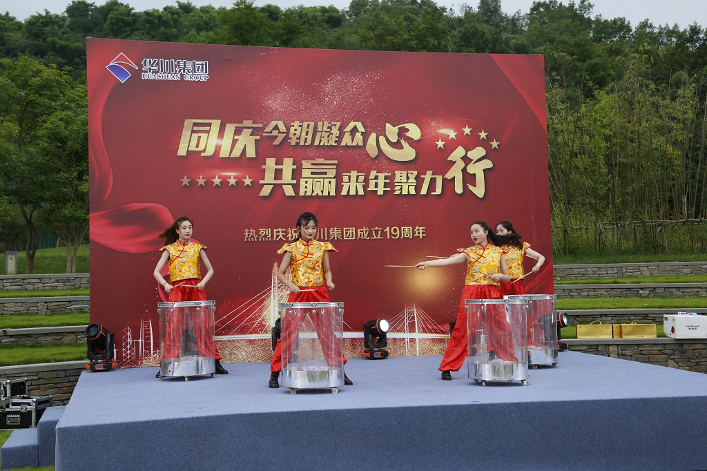 晚上,農(nóng)業(yè)總部基地?zé)艋痨陟?,集團(tuán)19周年慶典晚會(huì)在這里舉行。作為十九周年與二十周年的連接節(jié)點(diǎn),今晚過(guò)后將迎來(lái)集團(tuán)成立二十周年華誕,黨委副書記發(fā)布《關(guān)于慶祝集團(tuán)成立二十周年氛圍營(yíng)造工作的通知》,副總裁熊文發(fā)布《休養(yǎng)度假專項(xiàng)福利方案》。發(fā)布會(huì)后,一曲《盛世華誕》鼓舞劃破夜空,激烈昂揚(yáng)鼓聲將拉開了慶典的序幕。《今天是你的生日》,通過(guò)詞語(yǔ)改編,為集團(tuán)送上了美好的生日祝福;群舞《別樣風(fēng)華》,通過(guò)集團(tuán)女干部與文工團(tuán)溫婉柔美,猶如一幅曼妙的畫卷;朗誦加合唱的節(jié)目《華川力量》,字字鏗鏘,展示出華川人血脈里流淌的豪邁情懷和磅礴的力量。伴隨著晚風(fēng)習(xí)習(xí),周年慶典進(jìn)入尾聲,在《華川之歌》的歌聲中,大家自發(fā)走上舞臺(tái),齊聲合唱,伴隨著熟悉的曲調(diào),大家連連歡呼,為本次慶典劃上了圓滿的句號(hào)。