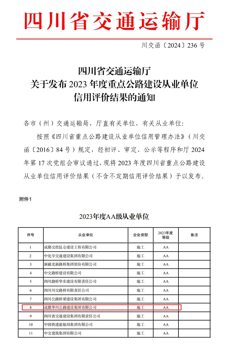 集團(tuán)榮獲四川省重點(diǎn)公路建設(shè)從業(yè)單位2023年度信用評價(jià)“AA”等級