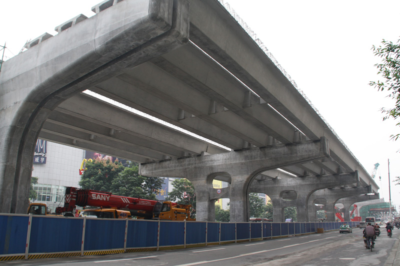 二環(huán)路東段改造工程路面施工,施工時(shí)間為2012年5月到2013年7月,投資為4.97億元,該工程北起二環(huán)路北府河橋東側(cè),向東經(jīng)商貿(mào)大道、火車(chē)北站、雙橋子立交,南止于二環(huán)路南府河橋東側(cè),全長(zhǎng)13.1公里。為“連續(xù)高架快速路+地面城市主干路”,底層道路按照雙向6-8車(chē)道建設(shè),高架快速車(chē)道為雙向6車(chē)道,路面面積80.43萬(wàn)m³。主要工程內(nèi)容包括:瀝青砼路面鋪裝(含噴砂打毛和防水層)、底層道路路面施工(含底基層、基層、面層、路緣石等附屬工程)